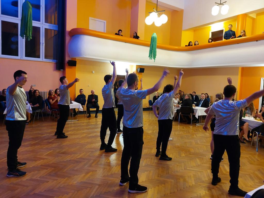 Učitelé, zaměstnanci školy, současní i bývalí žáci a další hosté se výborně bavili za doprovodu skupiny Pelíškové, zhlédli krásné předtančení maturitního ročníku žáků 4.A, vystoupení taneční skupiny Diamond Dance a Destiny.